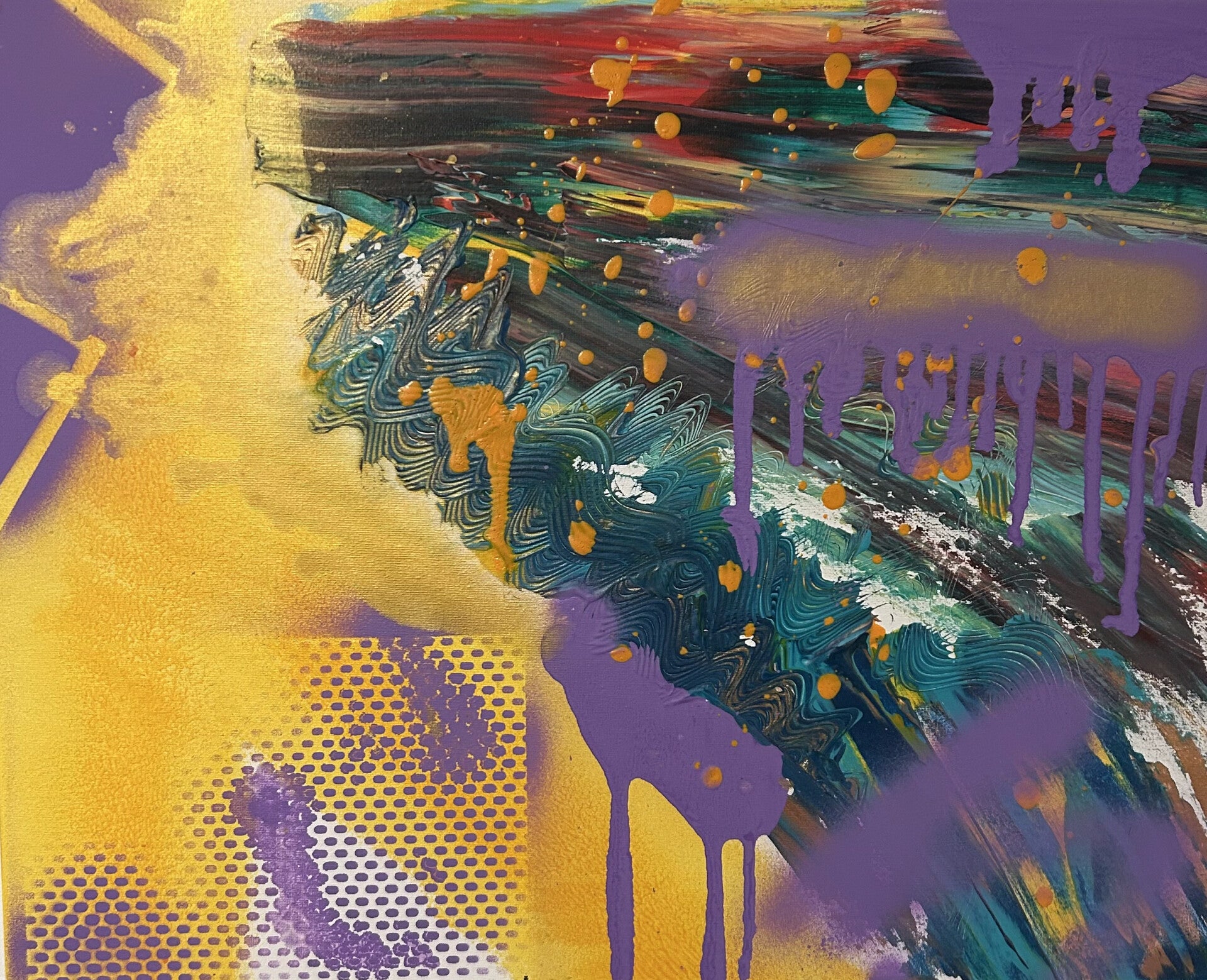 „Break of Colors“ ist ein kraftvolles, ausdrucksstarkes Unikat, das den Moment einfängt, in dem Farbe zu Energie wird. Dynamische Wellenbewegungen in Türkis und Grün brechen wie eine farbliche Brandung über die Leinwand und treffen auf leuchtende Gelbflächen, violette Drippings und kraftvolle Akzente in Orange.
