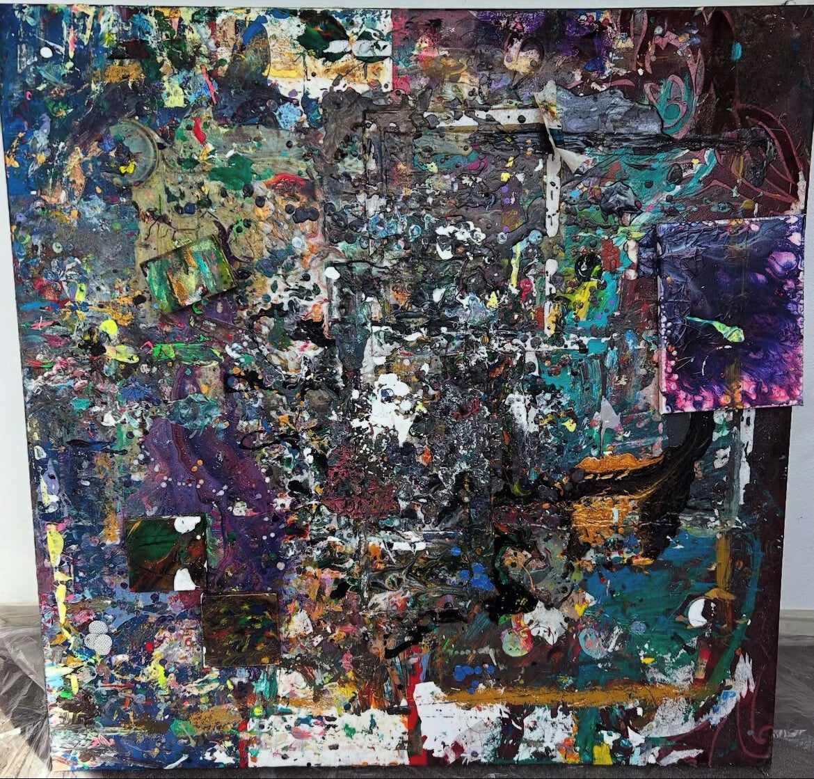 „Cosmic Collision“ ist ein großformatiges, energiegeladenes Unikat, das die rohe Kraft eines farblichen Urknalls einfängt. Das Werk zeigt ein dichtes Geflecht aus Farbschichten, Strukturen und organischen Fragmenten, die wie kollidierende Galaxien miteinander verschmelzen. Tiefe Violetttöne, leuchtendes Türkis, erdige Akzente und expressive Spritzer bilden ein lebendiges Chaos, das dennoch eine faszinierende innere Ordnung besitzt.
